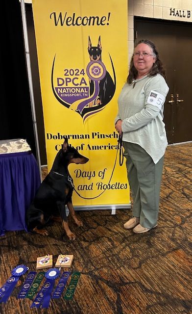 Valiant IB Victorious Ketterdobe (“Vic”) is an AKC CD, Trick Dog Novice, and Rally Novice, as well as a UKC Conformation Champion. Vic had a litter on February 16, 2026, sired by Lyndobes All-Wheel-Drive. Her next planned litter is expected in 2027.